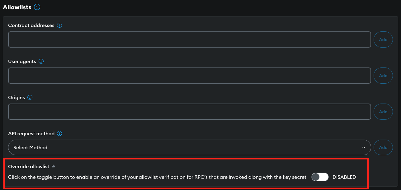 The OVERRIDE ALLOWLIST switch lets you override your allowlist settings when a request includes an API key secret. This means requests will be accepted even if an IP address or URL isn't on your allowlist, provided they include both the API key and the API key secret.